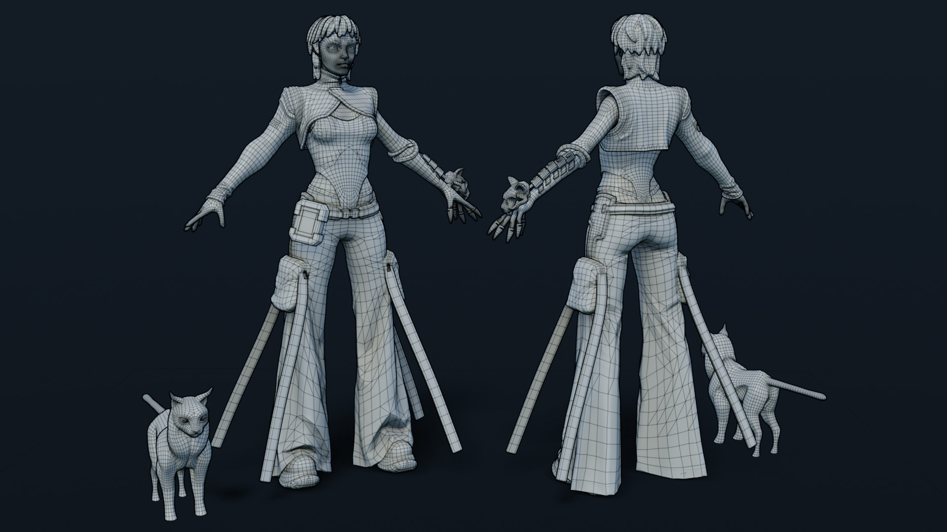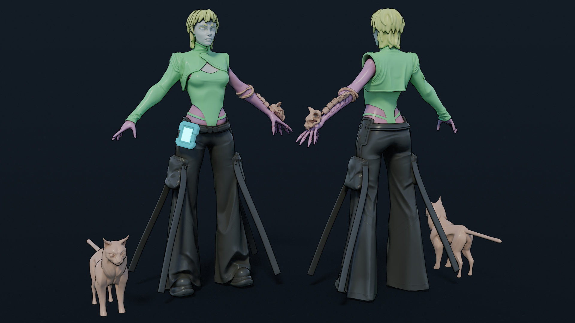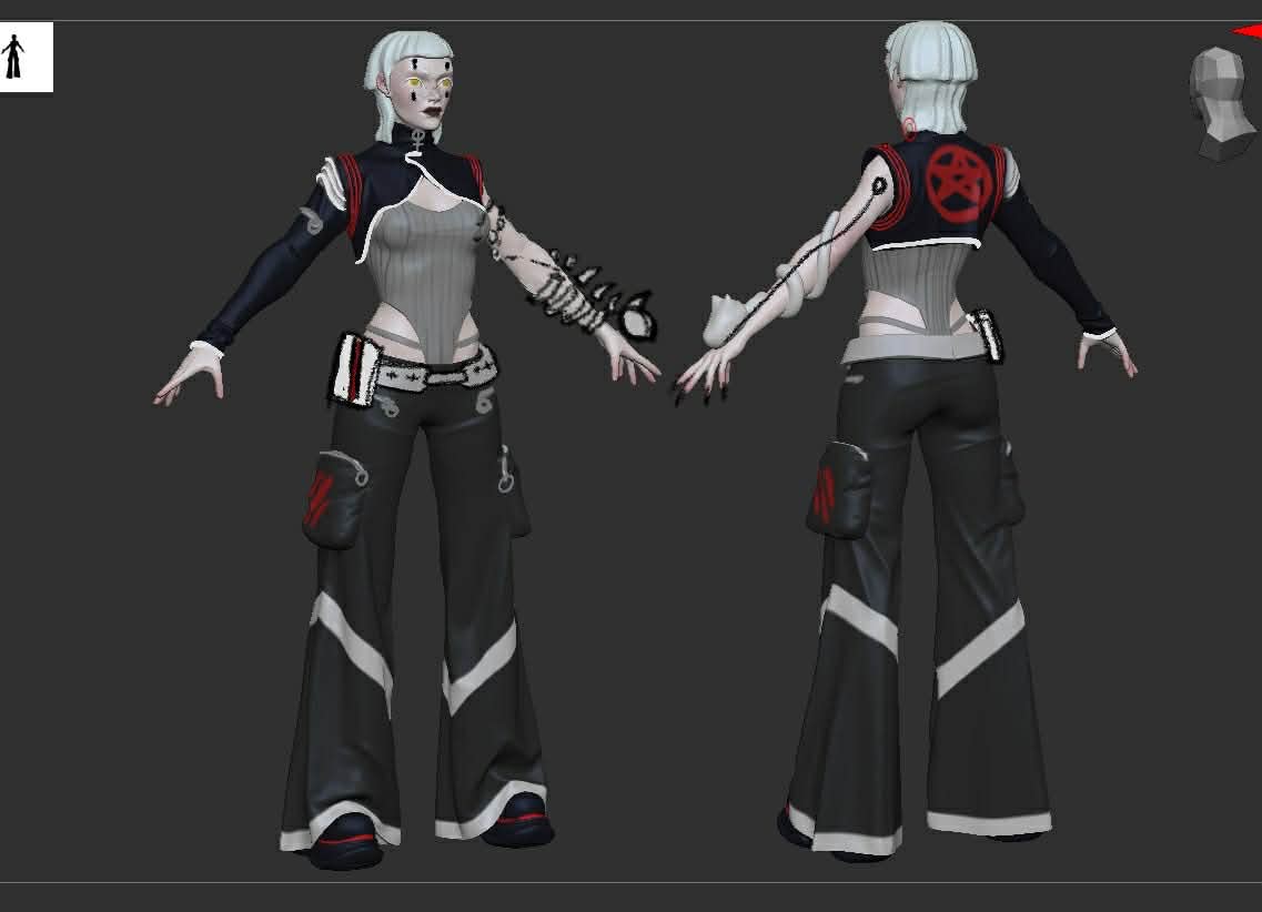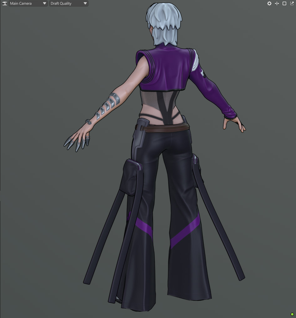 Needed a break from texturing so I threw in a quick rig and posed her up to have a bit more character. I also added in the 3D screen things on her arm and palm that would be how she hacks into stuff. The plan is to add the cat onto her shoulder but I haven’t got around to rigging/posing that yet