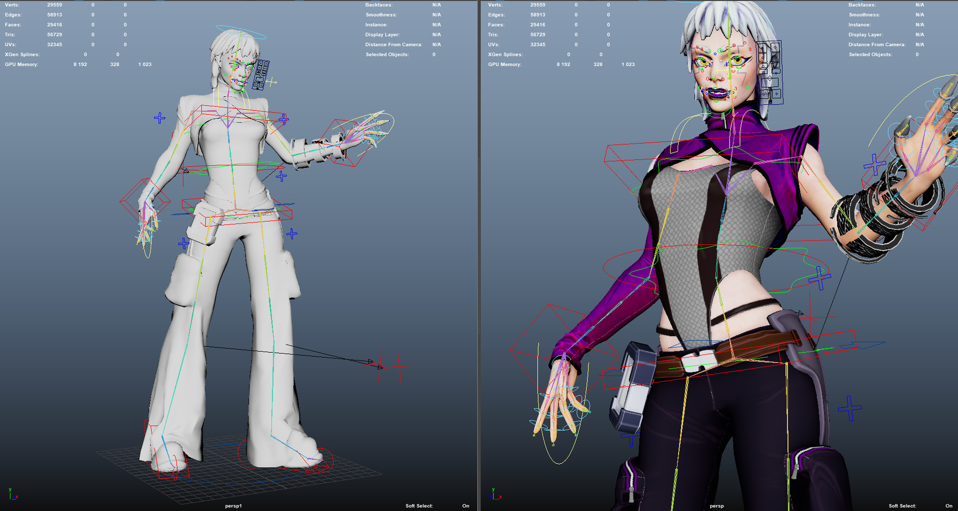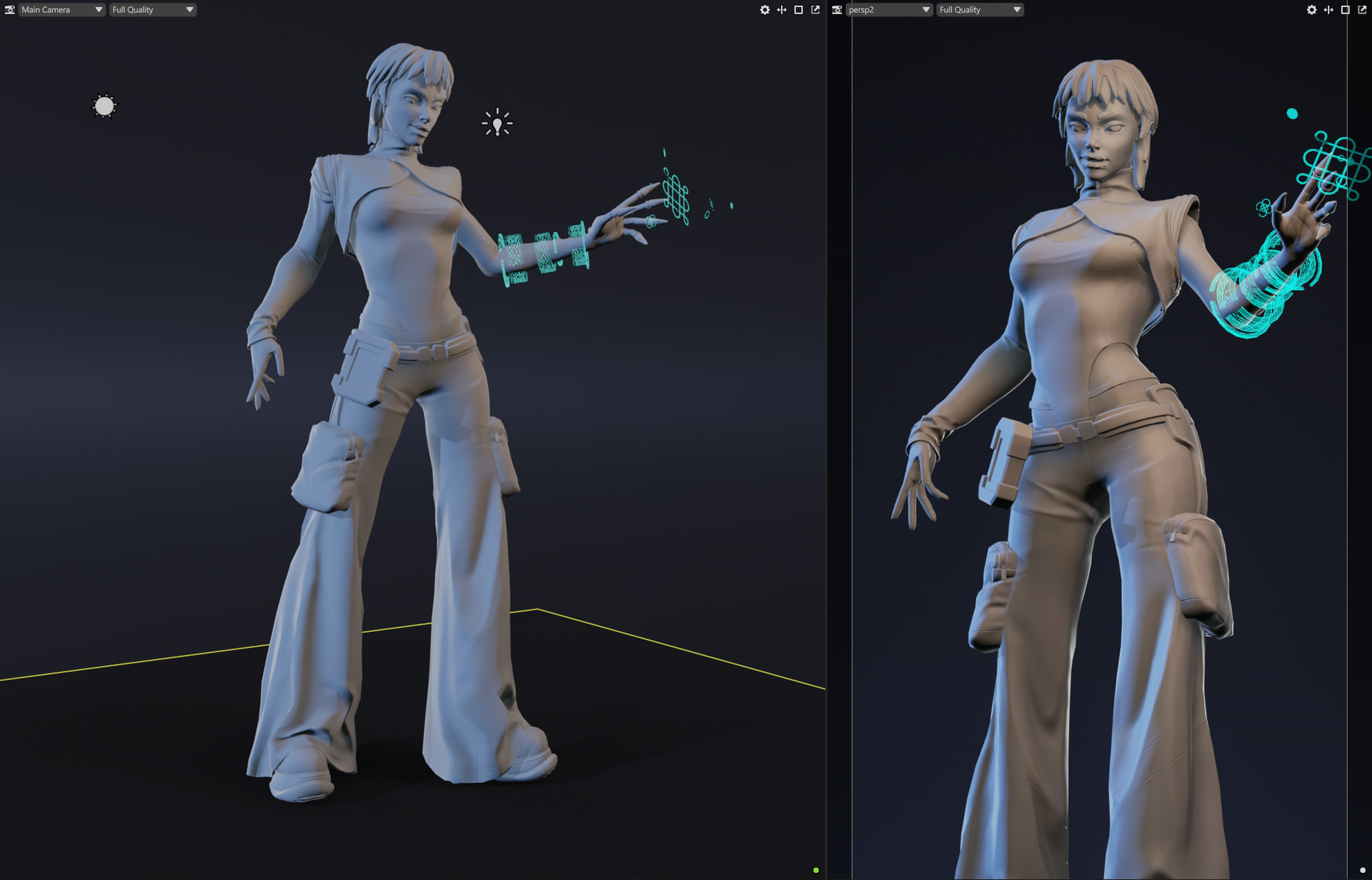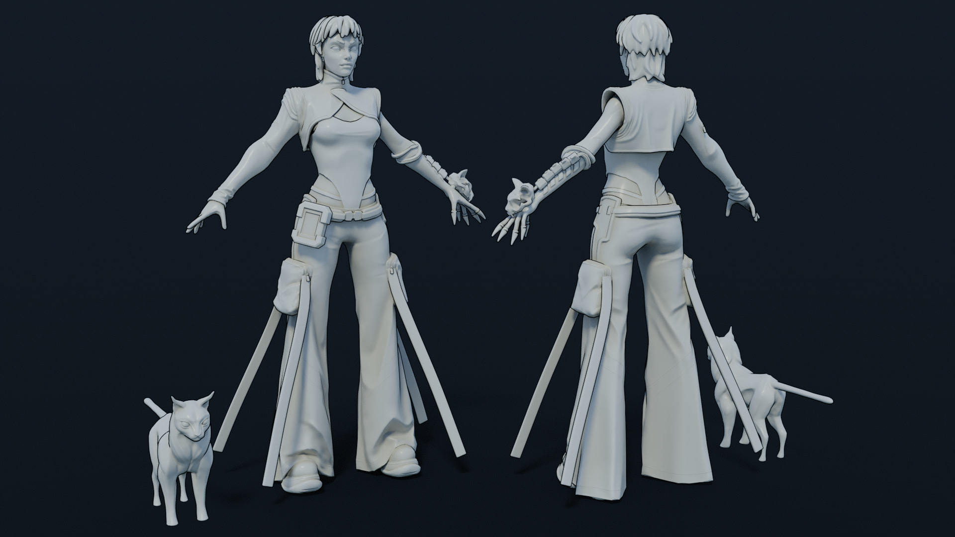 Needed a break from texturing so I threw in a quick rig and posed her up to have a bit more character. I also added in the 3D screen things on her arm and palm that would be how she hacks into stuff. The plan is to add the cat onto her shoulder but I haven’t got around to rigging/posing that yet