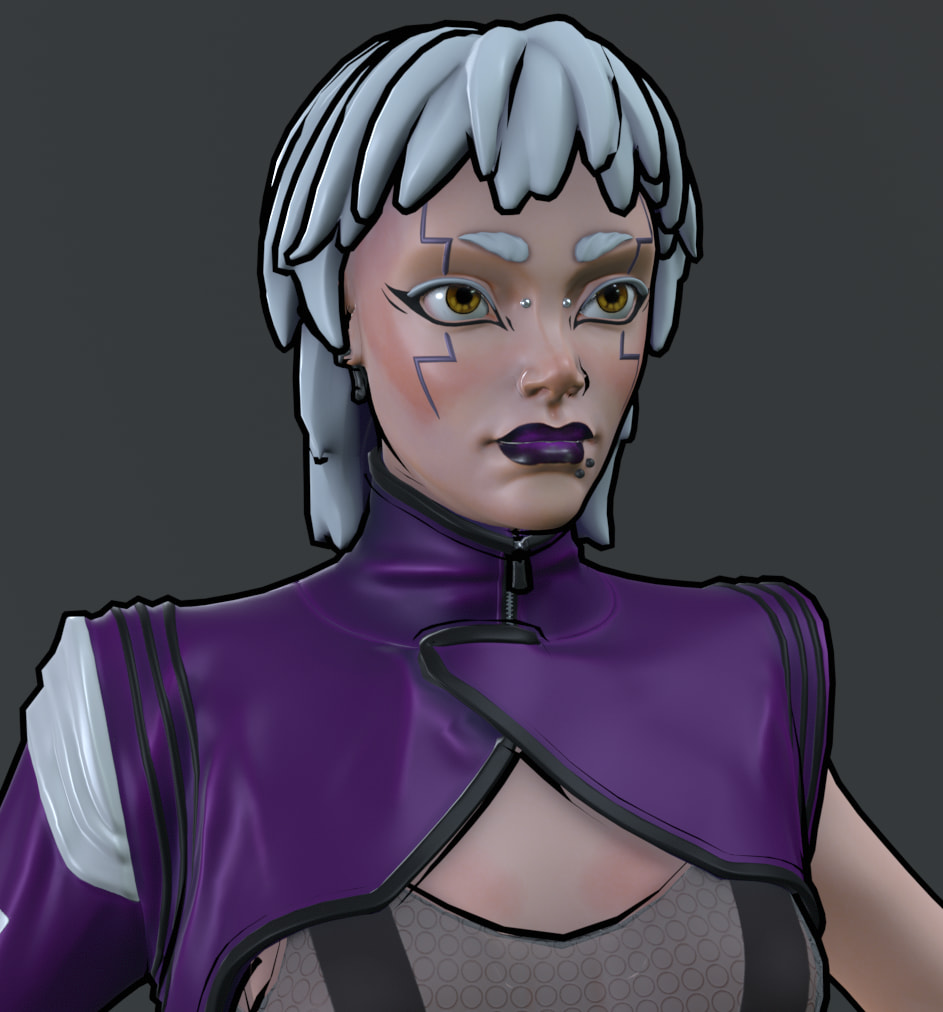 This future cat sidhe is a kind of hacker who has a hard-light hologram cat that she can control and uses to steal people’s data. Going for a goth witch but cyberpunk so hoping I can sell that in the final image. I also want to try make this in a borderlands/telltale comic book style, probably rendering in Marmoset. I’ve been doing a lot of realistic stuff lately so it’ll be nice to try some stylised work.