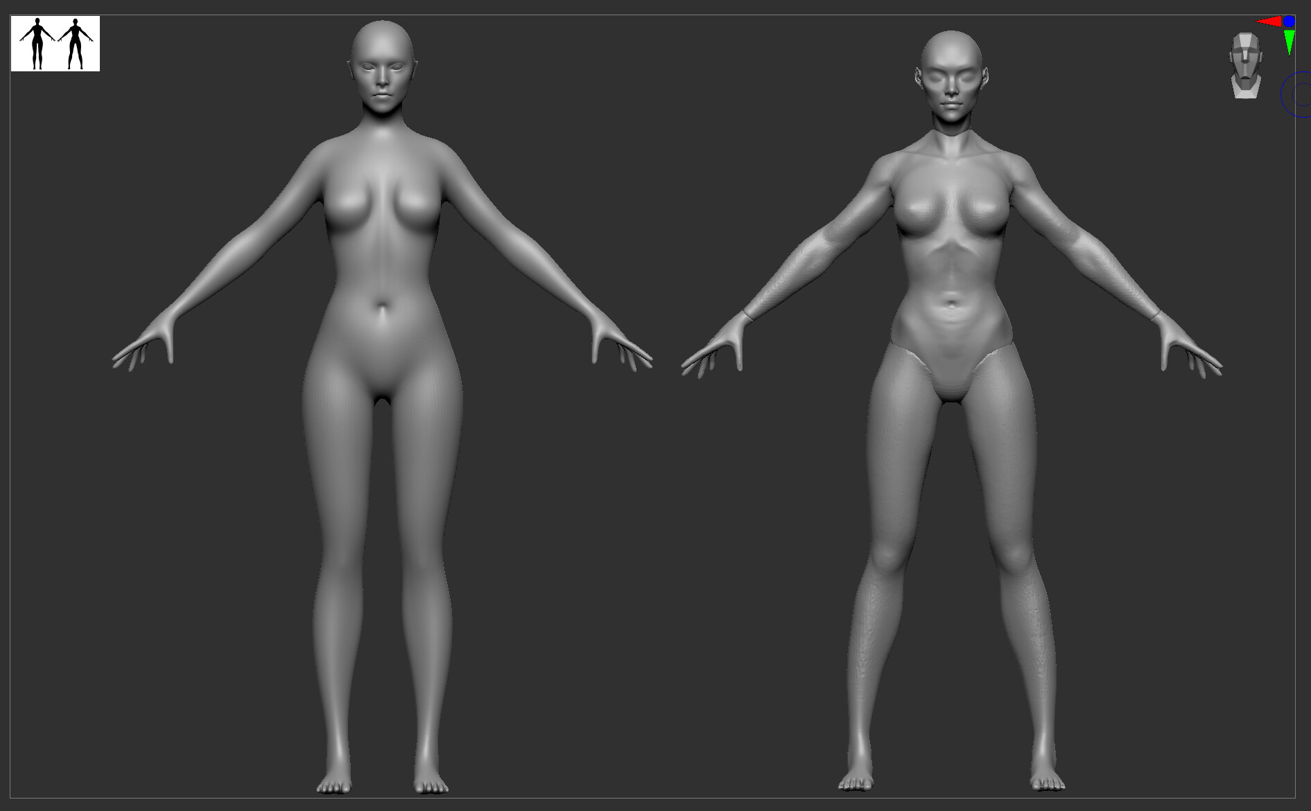 Here are a couple of super rough sketches for some base ideas. My plan is to get a base body ready to bring into Marvelous Designer and block in some quick clothing.