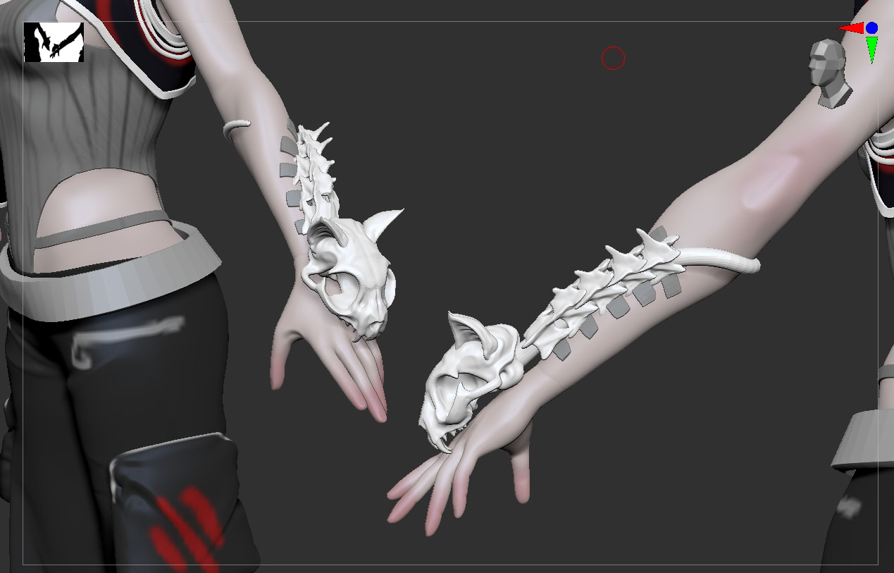 I also simplified the skull and vertebrae to help bring the design a bit closer together. Again, I’ll be adding ‘cyberware’ lines and stuff in the texturing stage but I feel a lot better about this now.