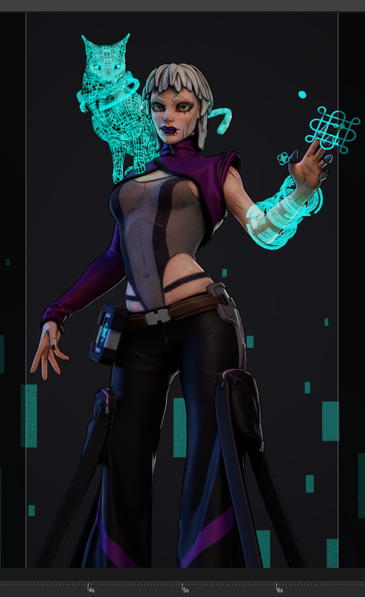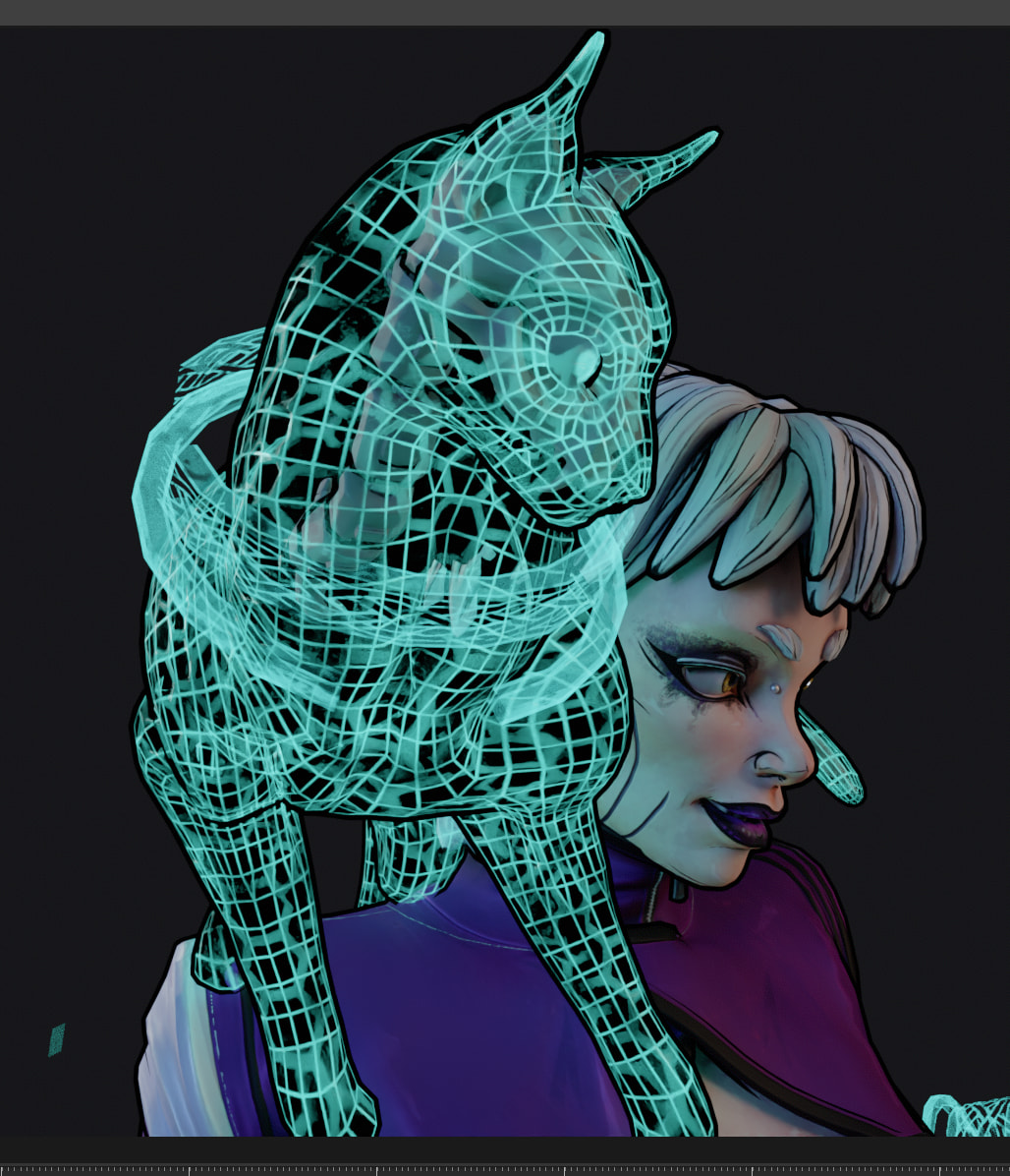 I also agree with Joanna on the above that its a little bit hard to read the face area on the cat right now though, would love to see some more of the cool skull/bone details you created! Maybe it needs a little bit of gradient/some fall off on the hologram effect so its not so intense up near the face, the contrast in values also might make the collar pop a bit more too