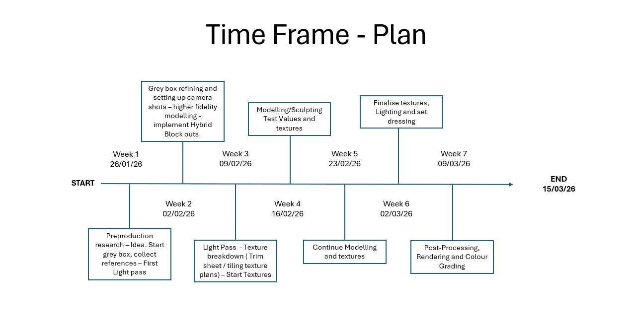 This was what I ended up with at the end of the week 2 sprint. The amount of work Ive done was not as what I expected and I was a little disappointed. However,I think this may be due to procrastination at the start of the project. Because im not working off a particular concept and rather an amalgamation of ideas. Its a bit of a come up with it while progressing. I’ve implemented Hybrid blocking in which I am using a rough estimated albedo and roughness value on the blockouts. This in the long run will help jump start how I want my textures to read going forward. I will be working in a large, medium, small format. focusing on what I want my focal point to be in the scene, then working away from it.
