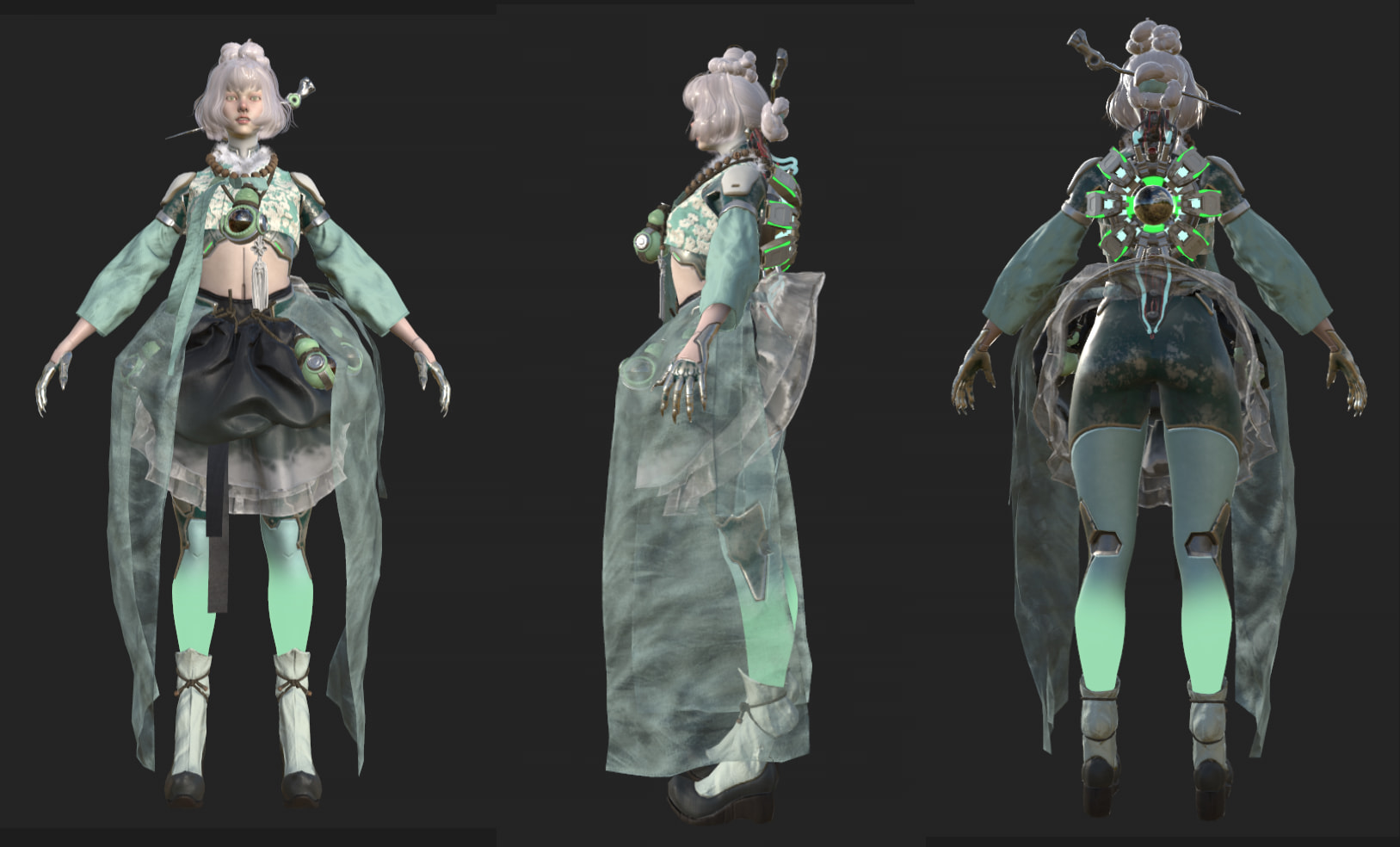 The focus of this design is to find a harmonious balance between Eastern mythological aesthetics, organic fur textures, and futuristic cyber materials, all within the framework of the gumiho myth.