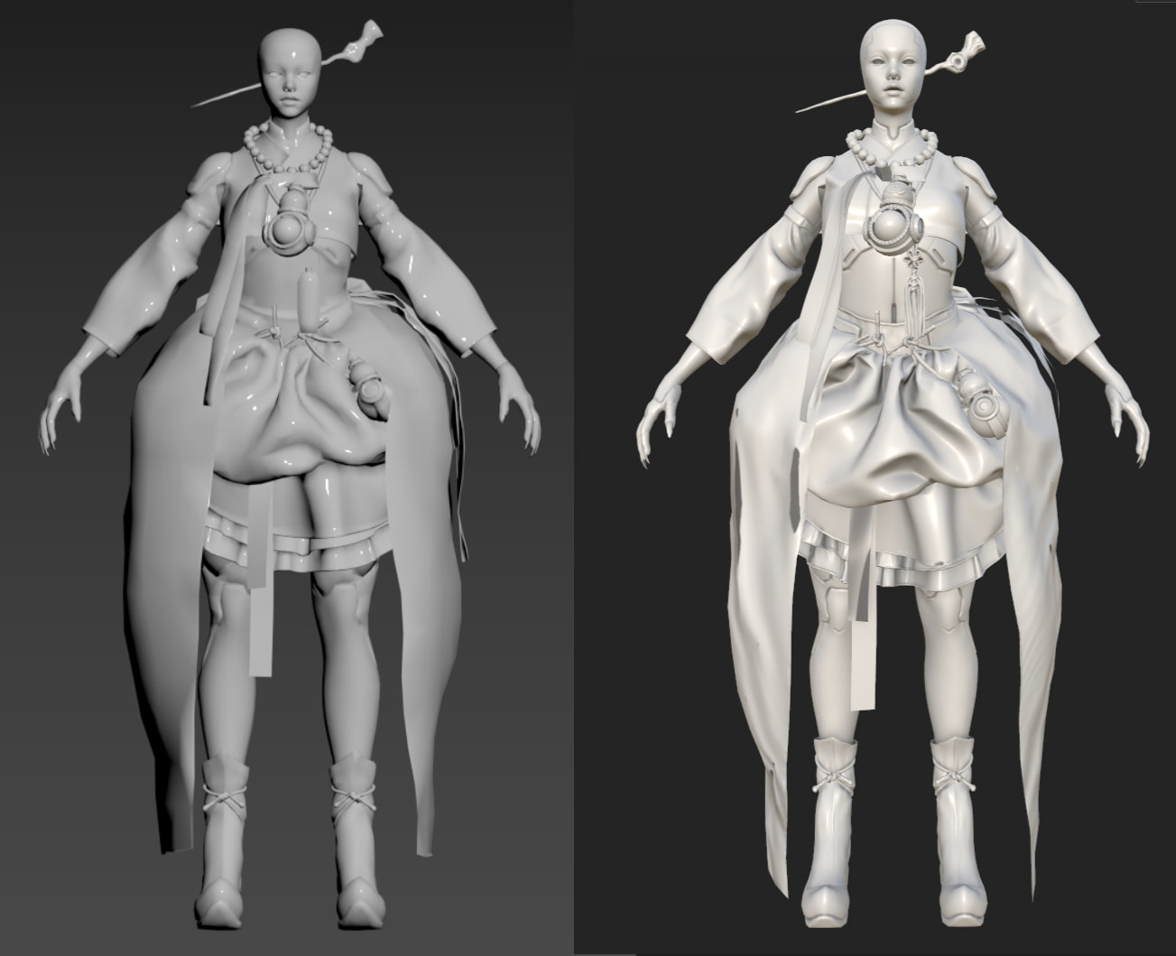 The second image shows the high‑poly sculpt in ZBrush, where I focused on maintaining a mystical, myth‑inspired atmosphere. I hope the final result stays close to the concept image and preserves the same overall mood.