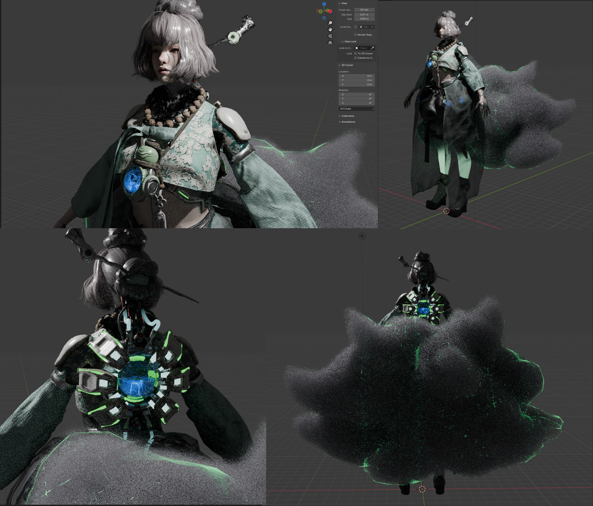 This project blends traditional Eastern elements—such as hanbok, jade, and a gourd bottle—with the gumiho’s core traits: white fur, nine tails, and the fox bead. These mythic features are reinterpreted through cyber elements like optical fibers and flowing electrical currents, visualizing the absorption of human souls and representing a being that exists in an incomplete, transitional cyber state.