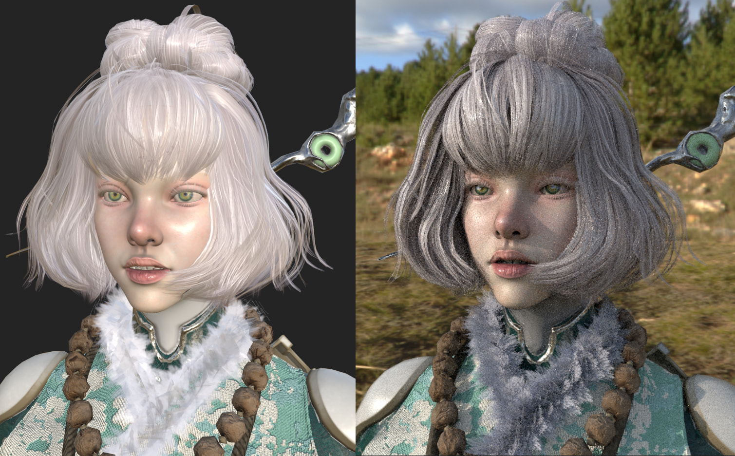 The last image is a test render from Substance Painter and Marmoset, where I’m checking the texture feel for the tail and the hair cards in advance. Yet the hair cards didn’t unwrap well, so I’m planning to fix all of the card meshes, UVs, and textures.