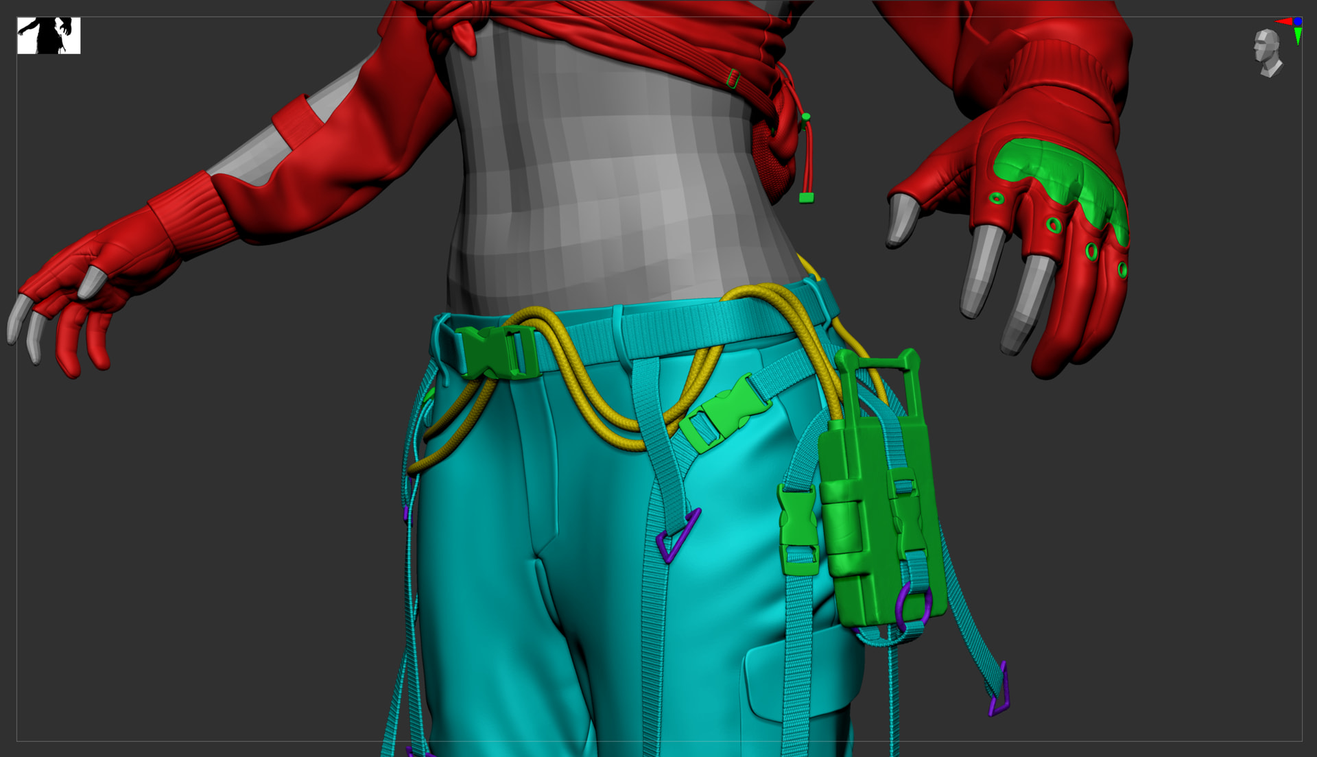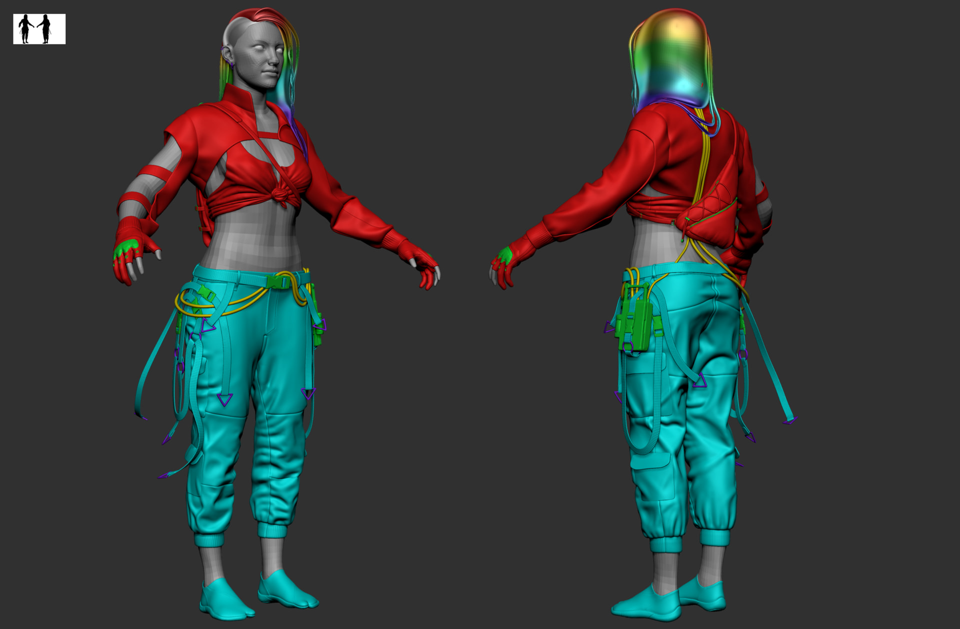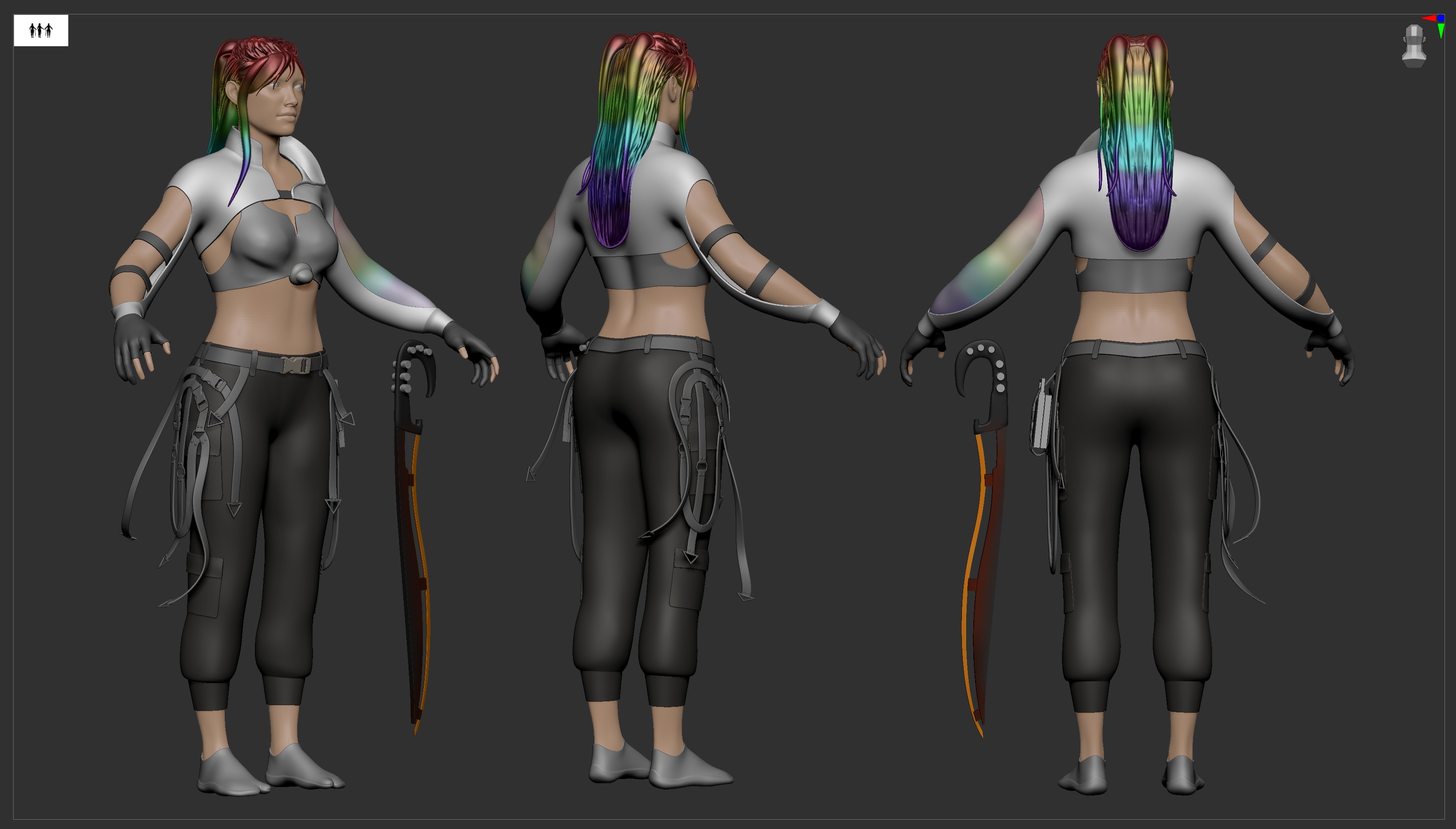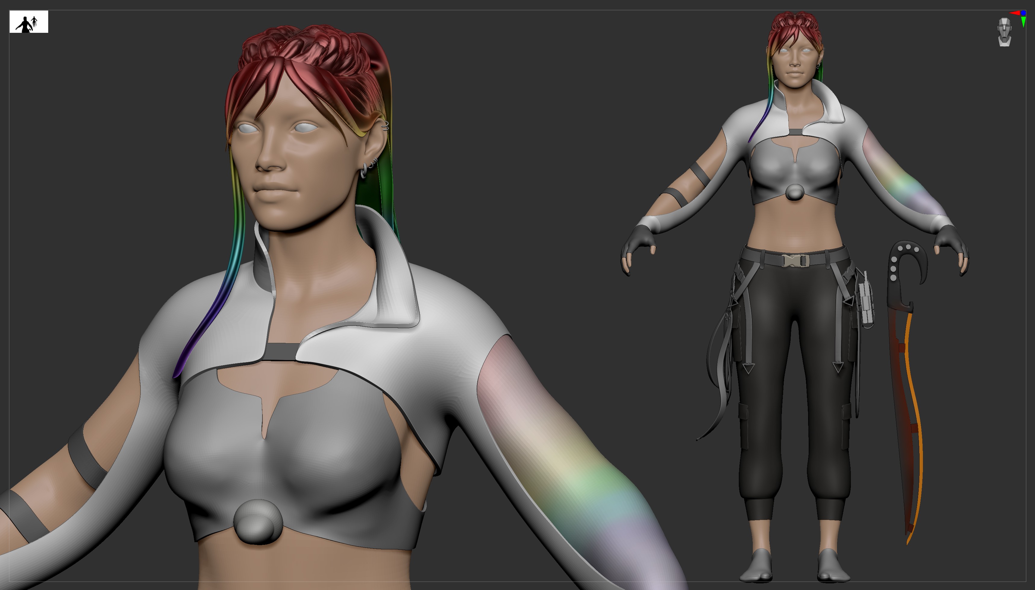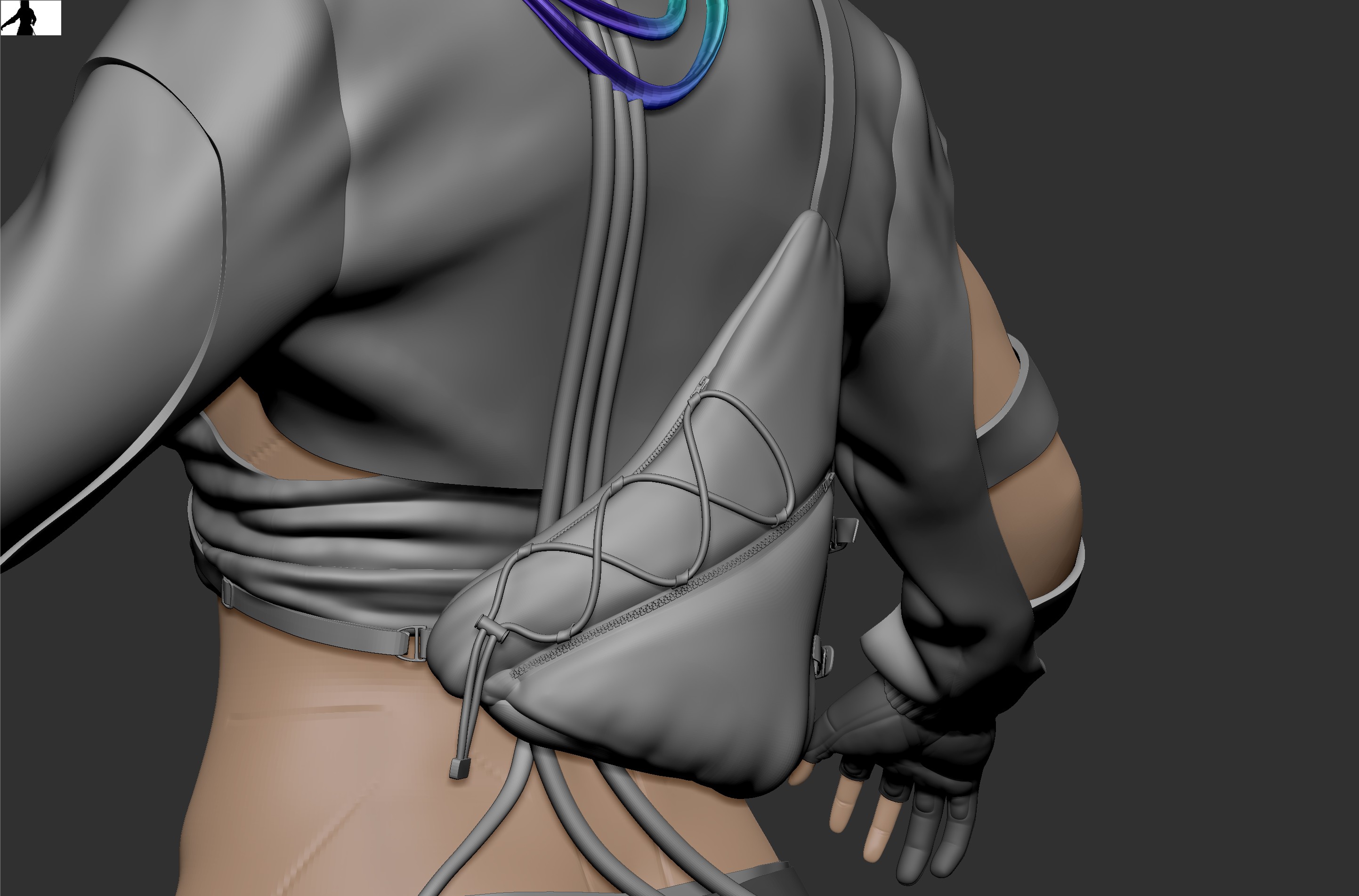 I’ve reworked the face and t-shirt as I wasn’t happy with how they were looking and I’ve added some detailing on the gloves and shoes, remodelled her cyberdeck and gotten the backpack modelled.