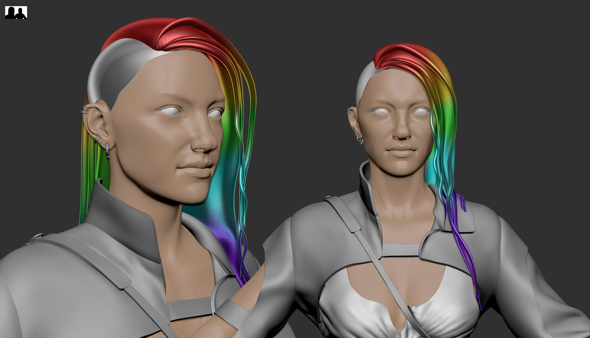 Since I last posted, I’ve created simmed versions of each of the major pieces of clothing (still gotta look at simming her bag, but I think thats the last one? I’m planning to just look at sculpting over the shoes I’ve already blocked out and I’m undecided atm on simming her gloves or not). I’ve also decided to change the hairstyle as I didn’t think the other one suited the character’s face as much, so I’ve done a new blockout for that.
