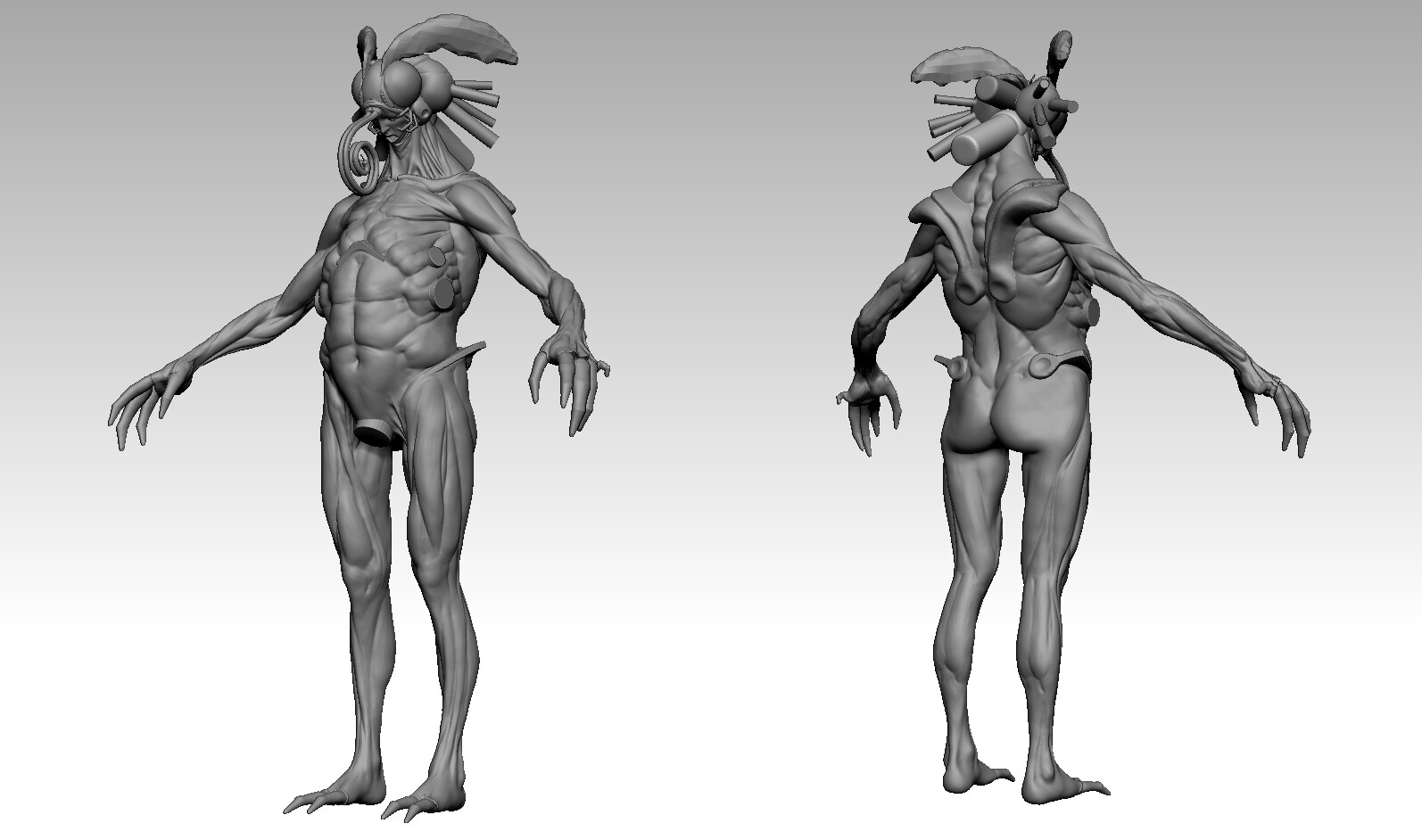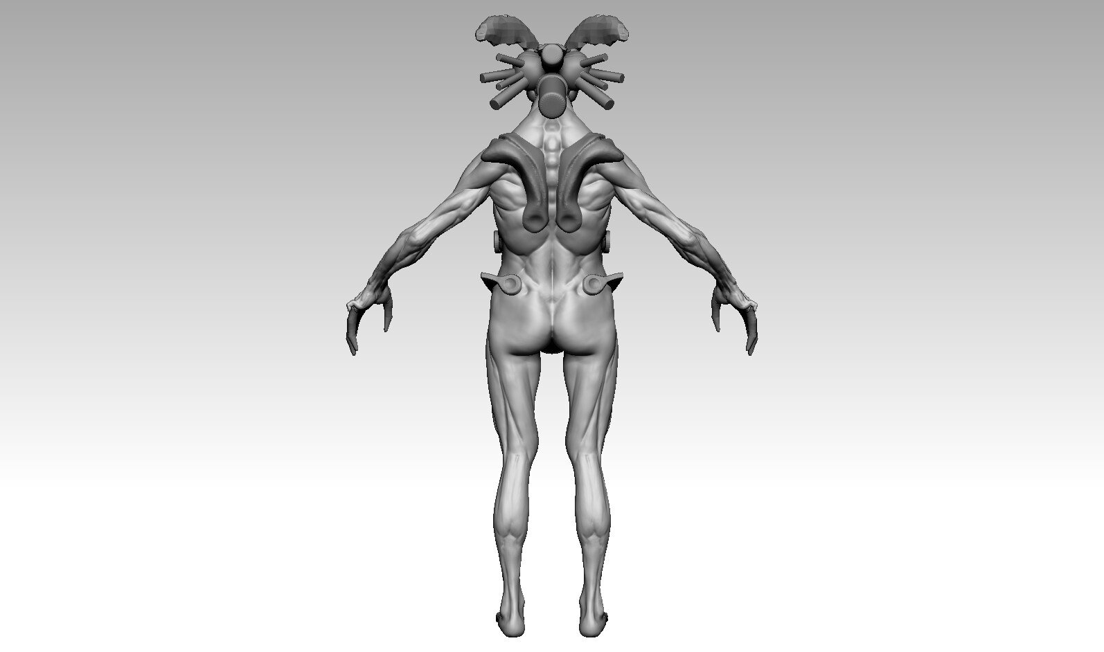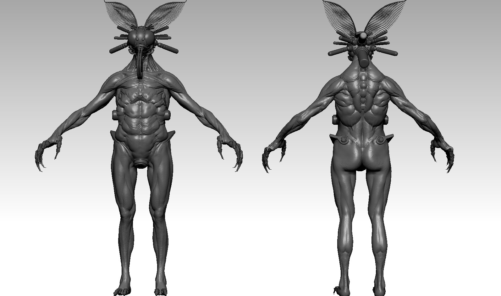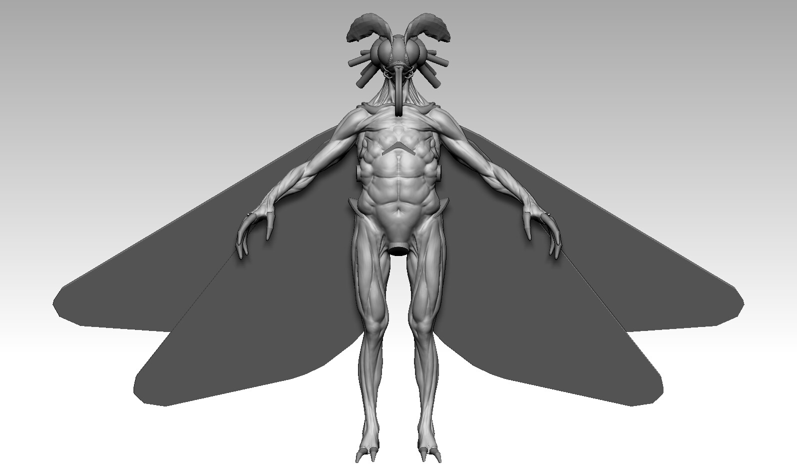 hey, here is my blockout, I wanted to do a slightly simple design since I don’t have much time. Also, I’m trying to keep that scary idea so I will do a deformed body anatomy with mechanical stuff going out of it’s head, fingers, and other body part to show that a mechanical creature is parasitizing this human body from the inside forming that moth like shape.
