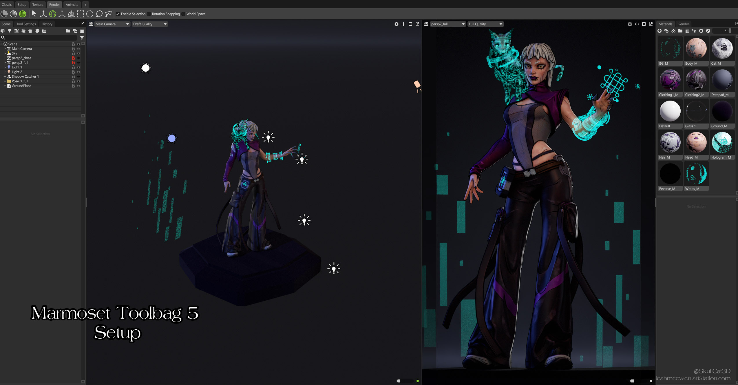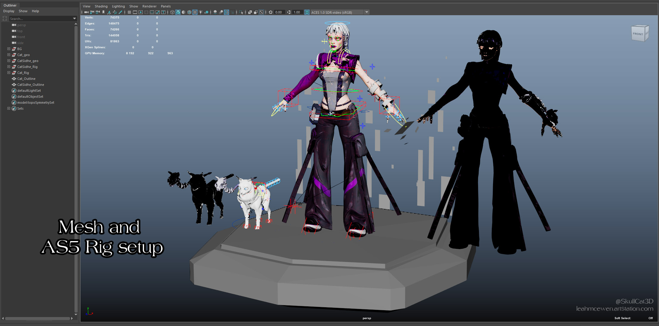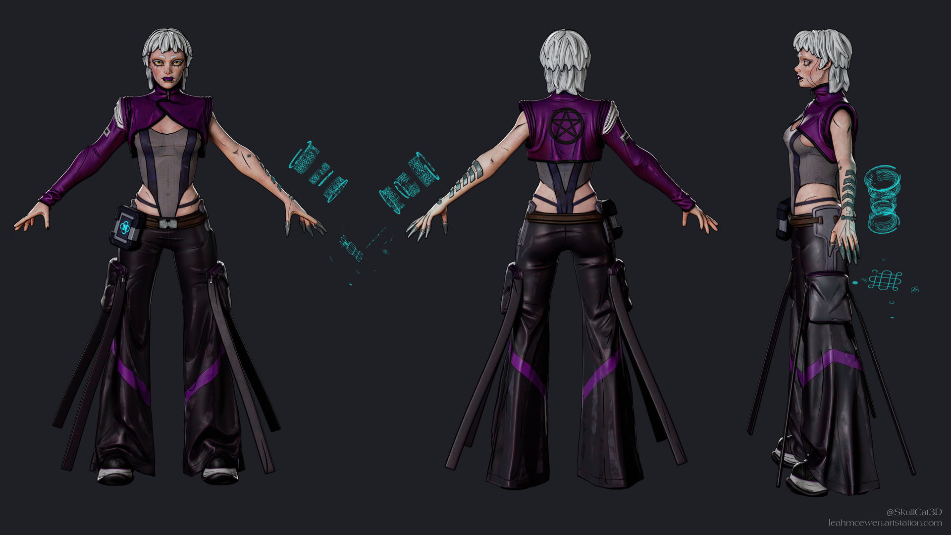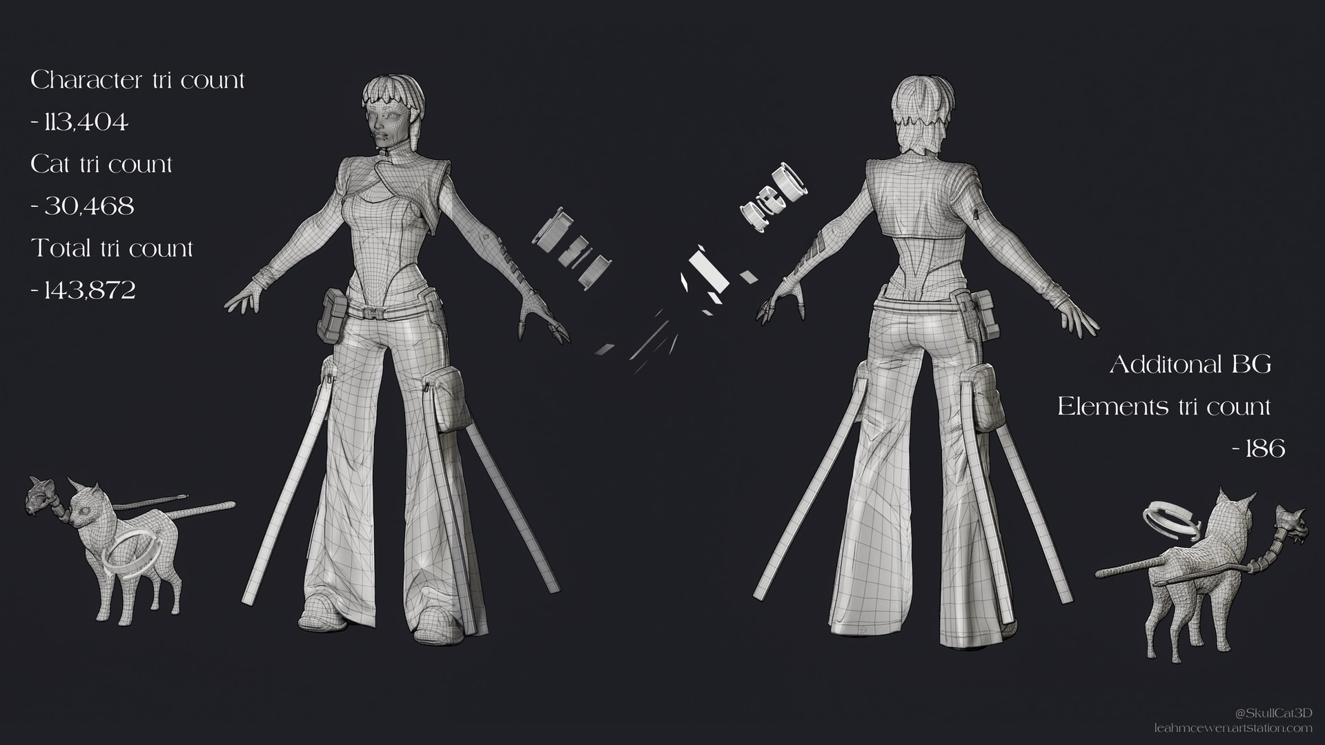 Inspired by cyberpunk and the aesthetics of Borderlands, I created the Cat Sidhe using ZBrush, Maya, Marvelous Designer, Marmoset Toolbag 5, and Photoshop.