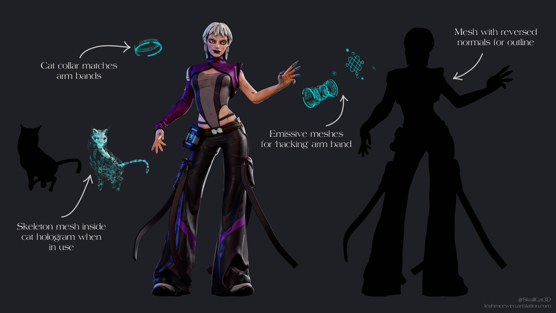The Cat Sidhe is a mythical witch said to be able to turn into a cat and steal people’s souls. In a future filled with tech, what’s closest to a soul than a persons lifetime of information? The cat sidhe now uses a cybernetic cat with a hard-light hologram to stealthily hack into people’s digital lives and steal whatever she can sell using the hacking device built into her arm. She keeps her cat close when not in use, wrapped around her arm, as if it were a part of her.