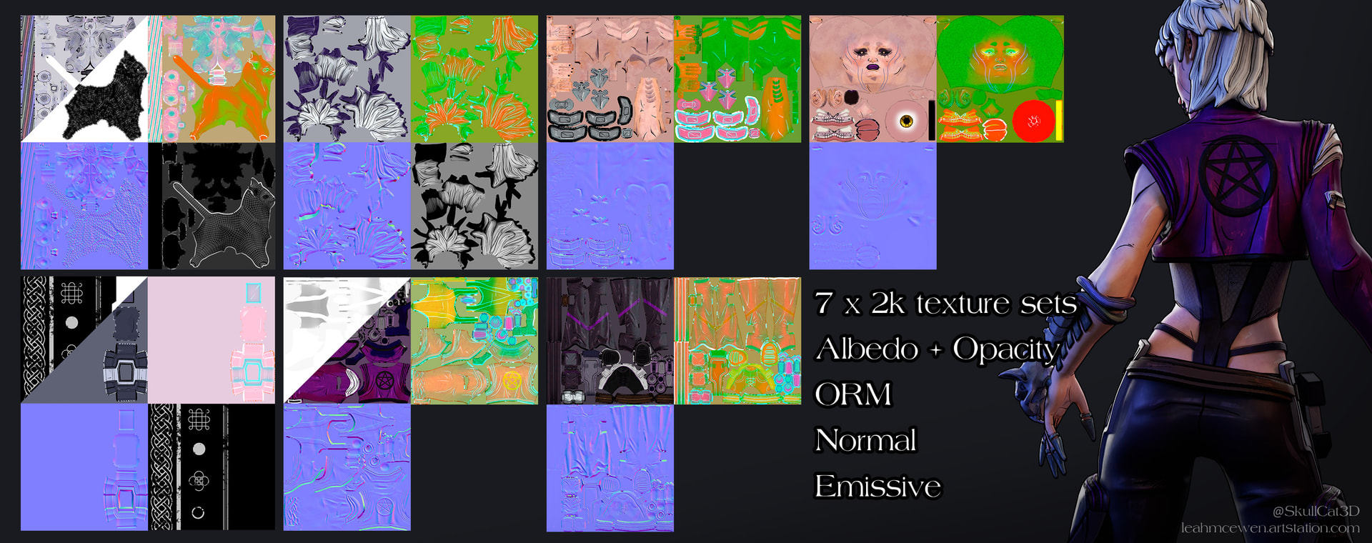 There are a total of 7 2k texture sets using Albedo with Opacity packed into the alpha channel, packed ORM, Normal, and some maps (Cat, Datapad and Hair) have Emissive textures.