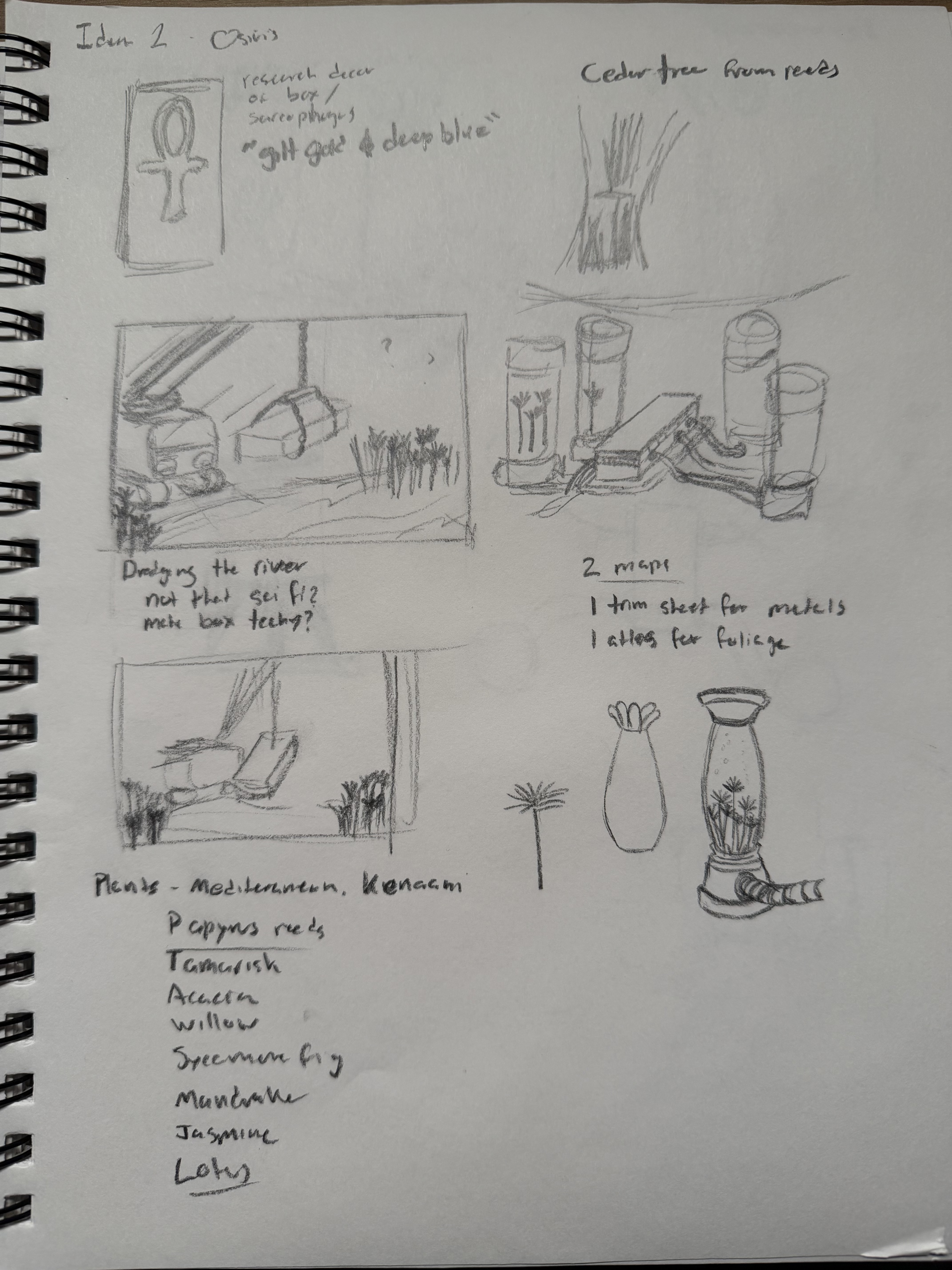 For my submission I will be exploring the Egyptian myth of the death of Osiris. Like all myths there are many variations, and versions of this story can be quite involved. I will be focusing on the beginning of the myth, from a version compiled by Plutarch, and which may not be of true Egyptian origin at all. In this version Osiris is betrayed by his brother Set, sealed in a box, and cast into the Nile where he drowns. The box containing the corpse of a god eventually washes up on the shores of ancient Lebanon, where the life giving powers of Osiris cause the reeds of the river to encase the box, eventually forming a huge tree with the god inside. My scene will imagine an alternate path for the myth, in which the box is never found, and remains at the bottom of the sea for thousands of years. That is until a near future society discovers it and, recognizing its life giving properties, begins to research ways to harness its energy as a resource to be exploited.