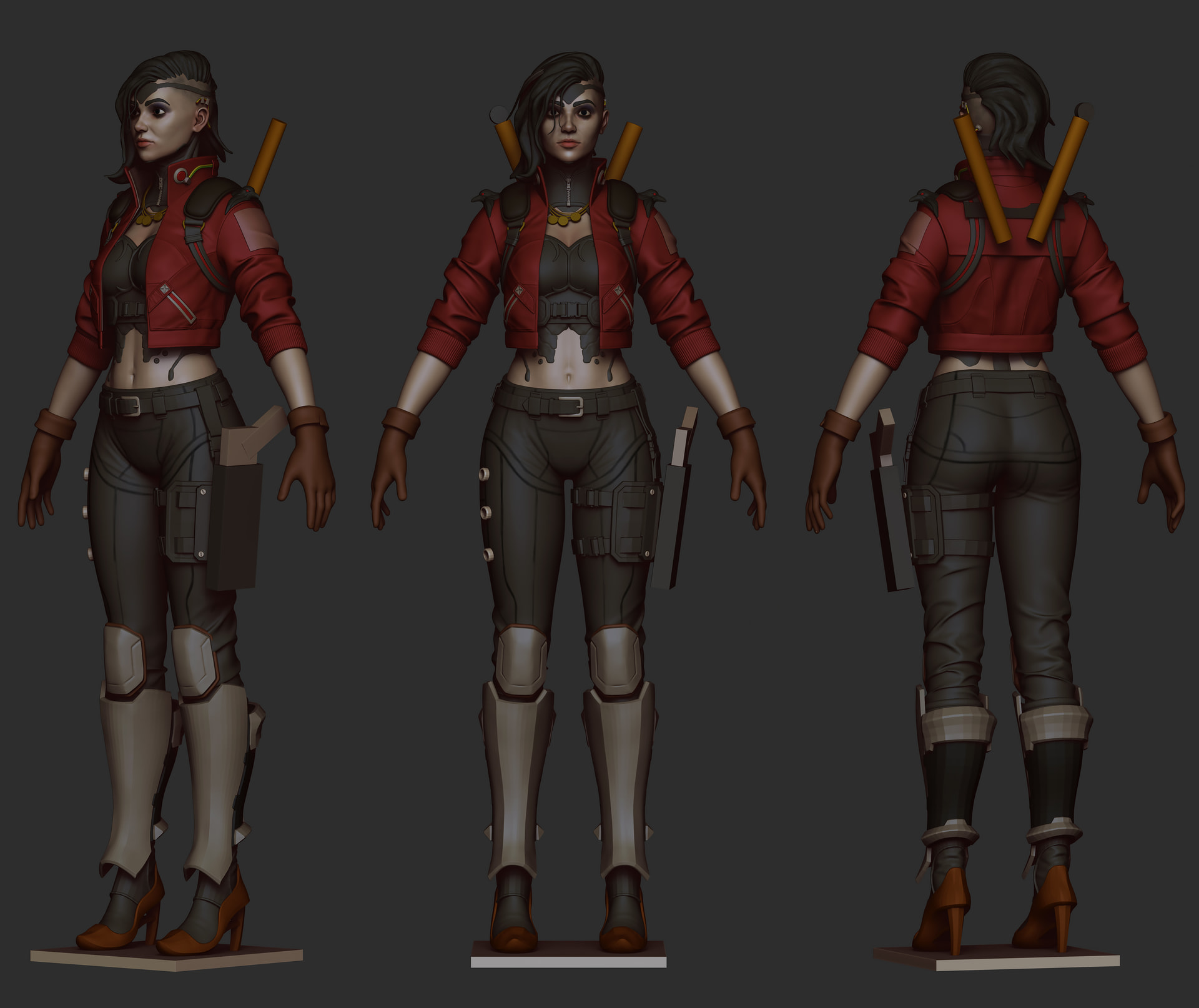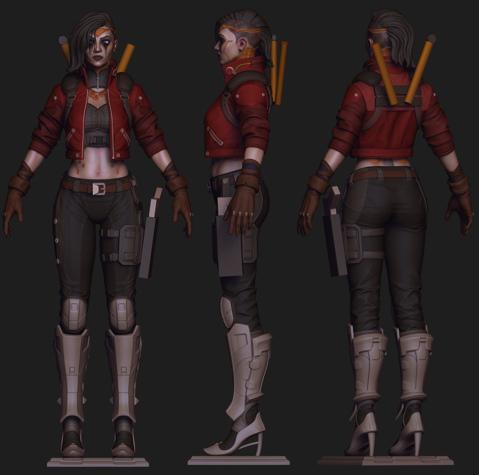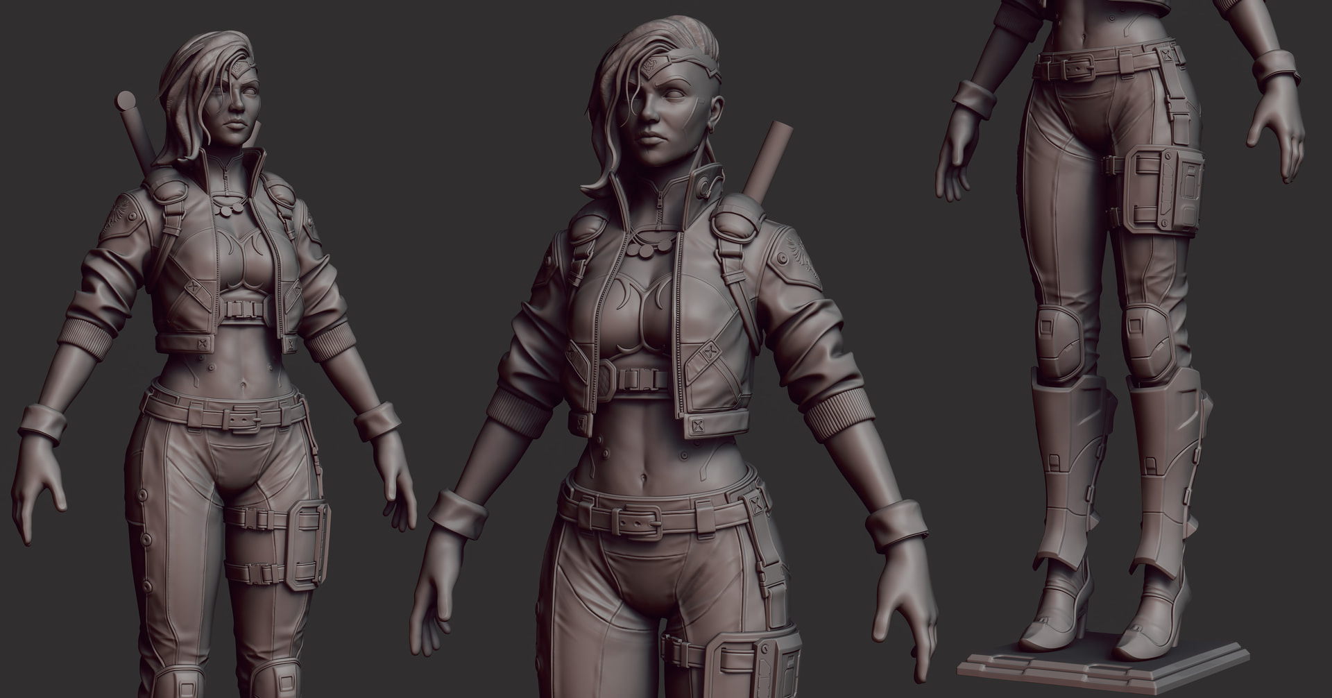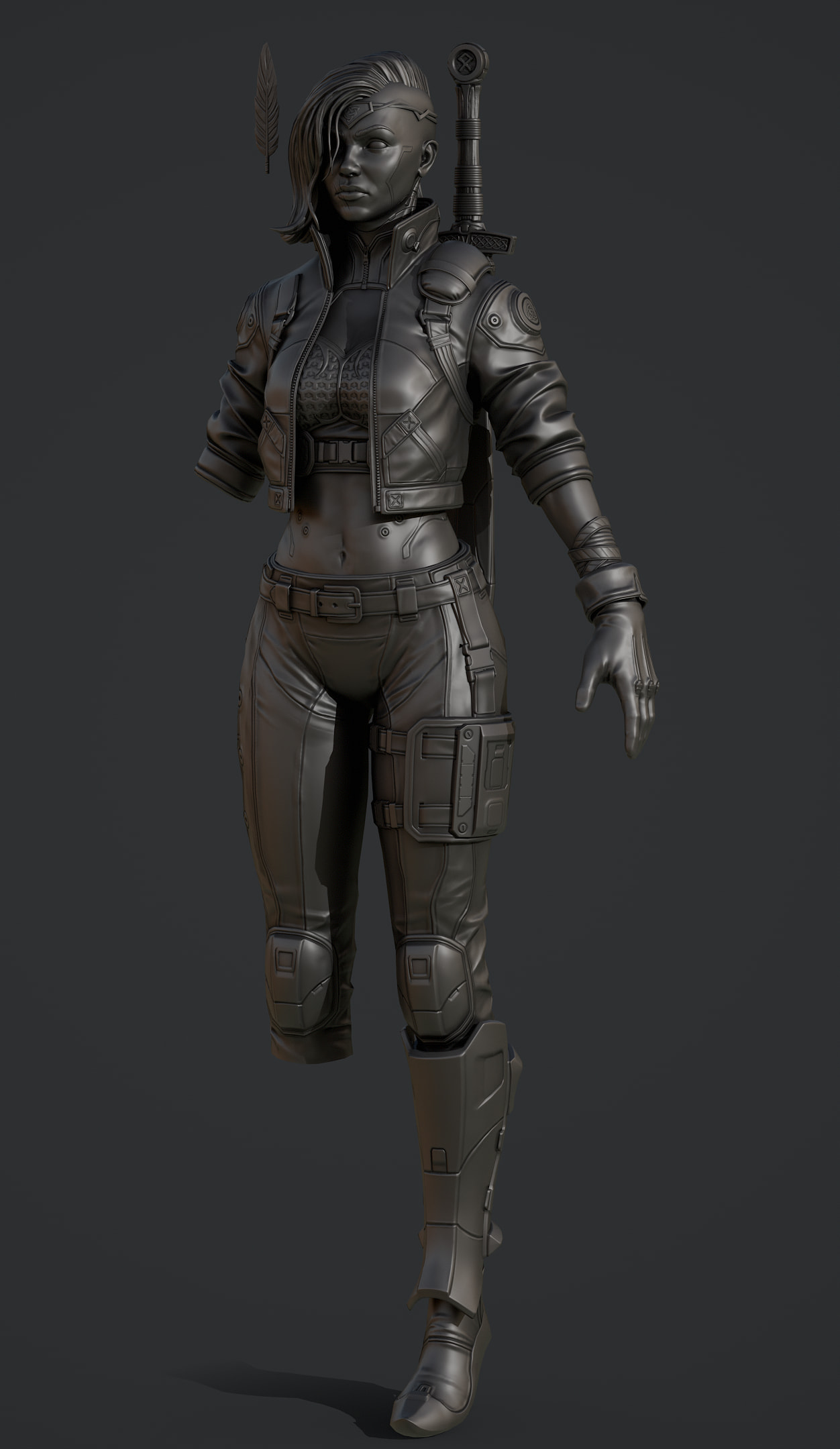 I worked on medium shapes in the pants, boots, jacket. Worked on her implants more and I think next I’ll work on her portrait a bit and then finish her clothes, the flow isn’t perfect yet and I can find some better shape language here and there I think.