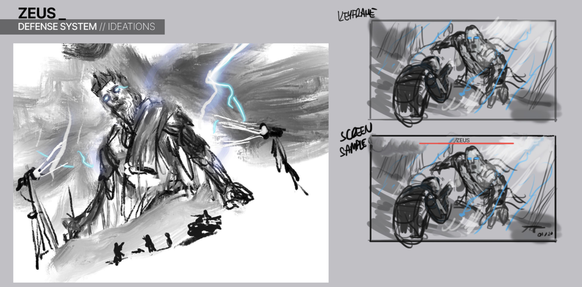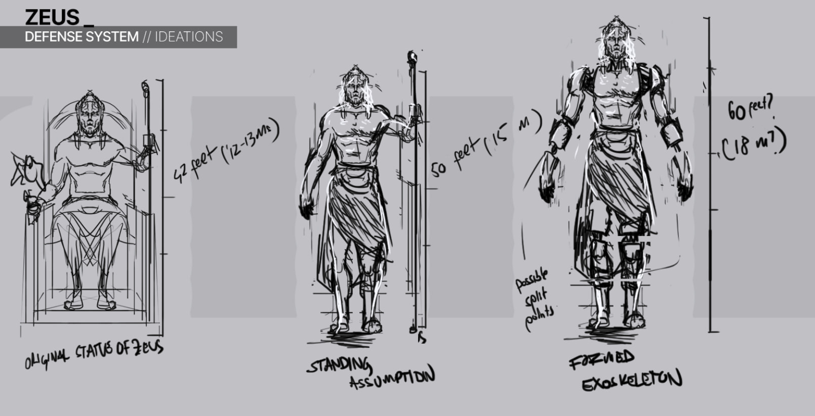 Piece by piece, the Zeus defense system reactivates its “pantheon” of gods across the world, where they build their physical bodies, each one as physically grand and as large as possible. By utilizing the automated machinery and factories👀